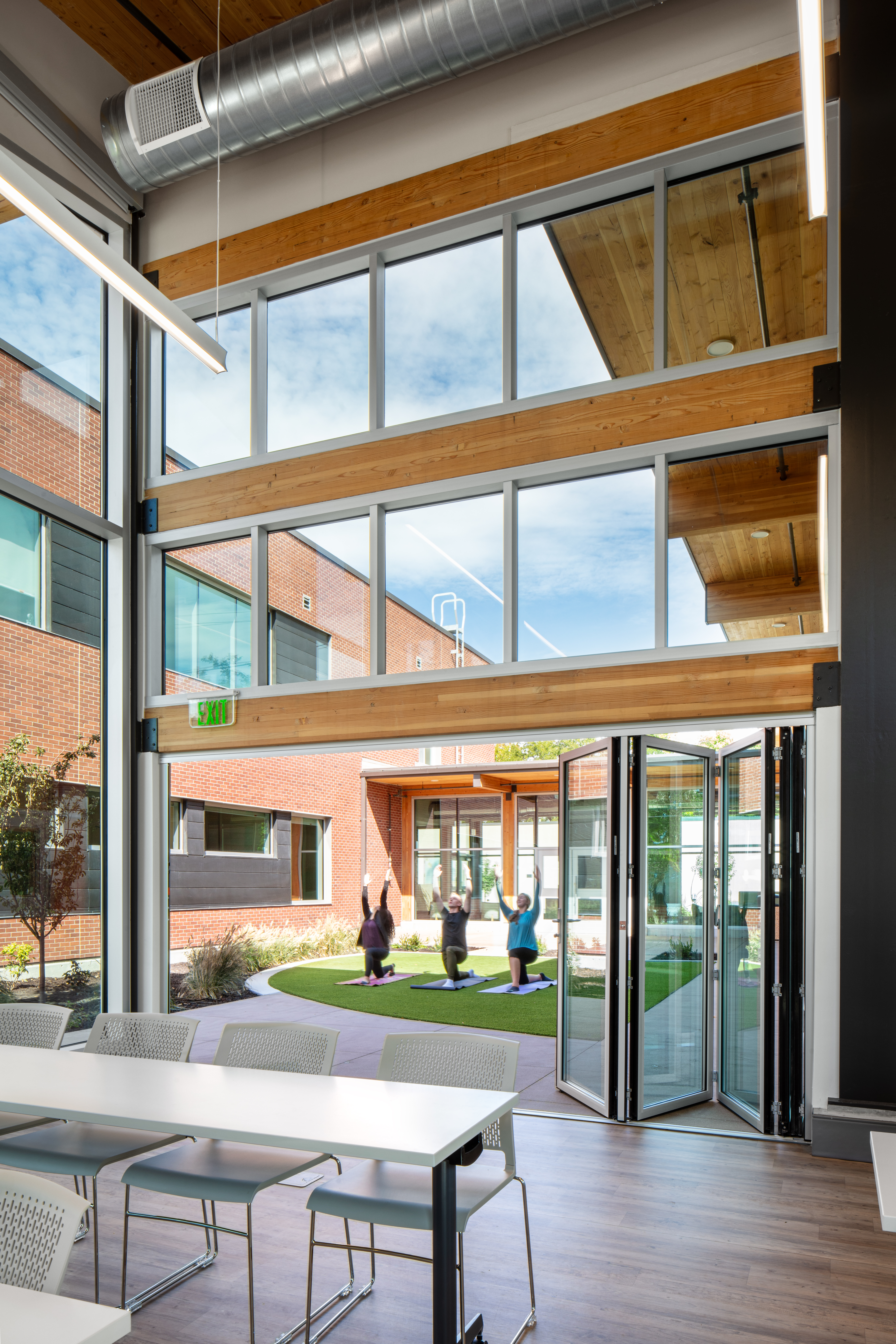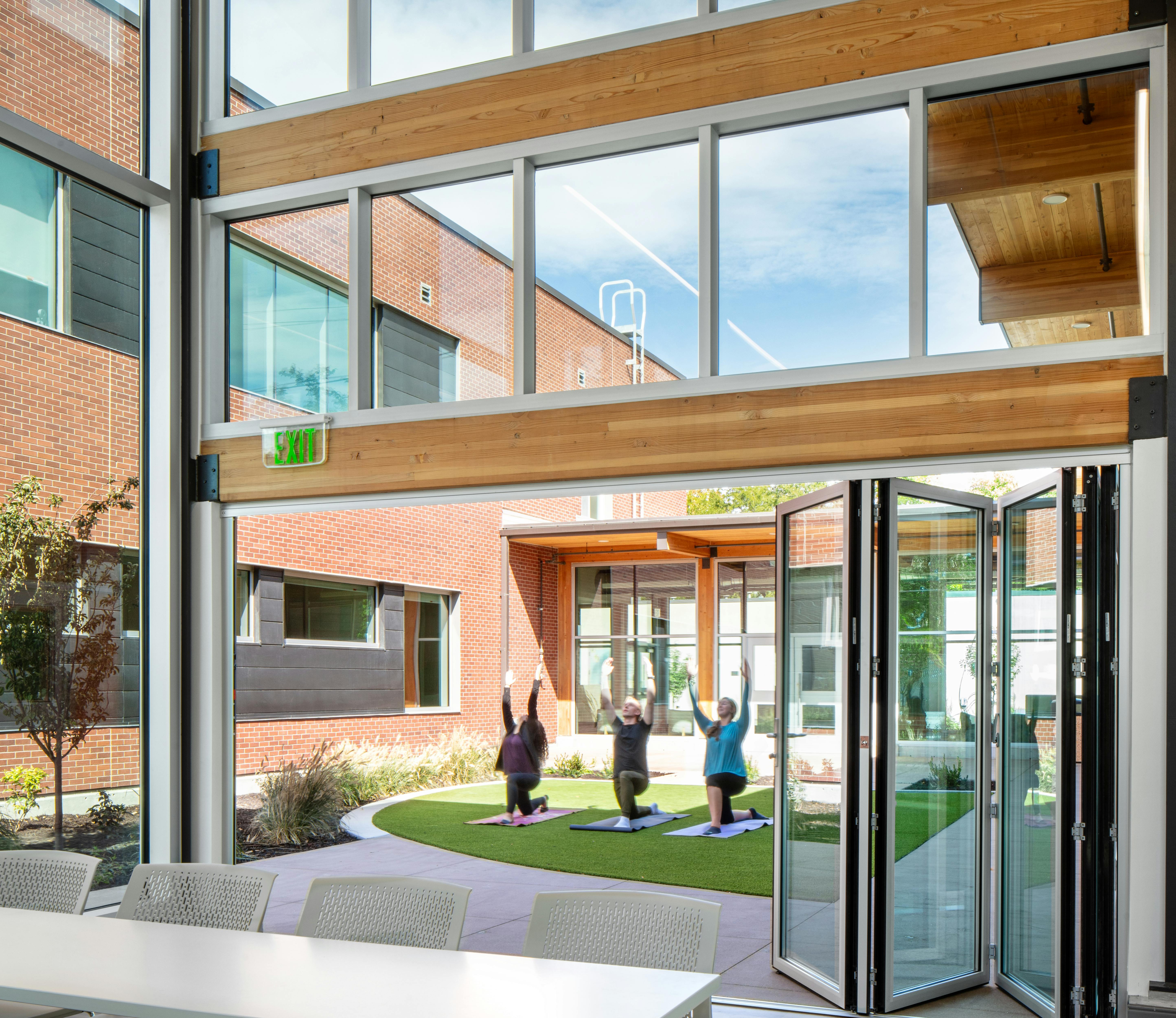 The building includes a health clinic in addition to spaces for individual and group therapy, student-led gatherings, fitness spaces, and a demonstration kitchen where students can learn about meal preparation and budgeting. The standout feature of the center is a central courtyard, symbolizing the building’s connection to the outside world and providing a tranquil environment for students to enjoy.