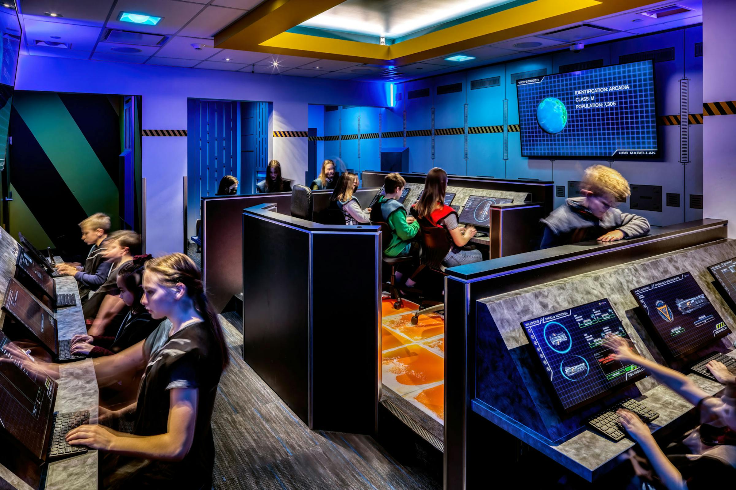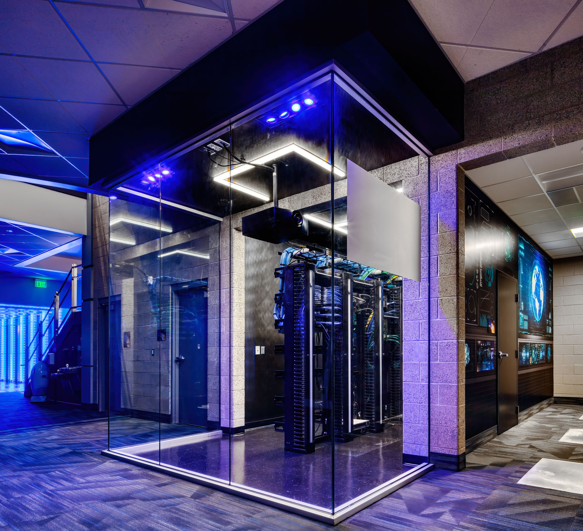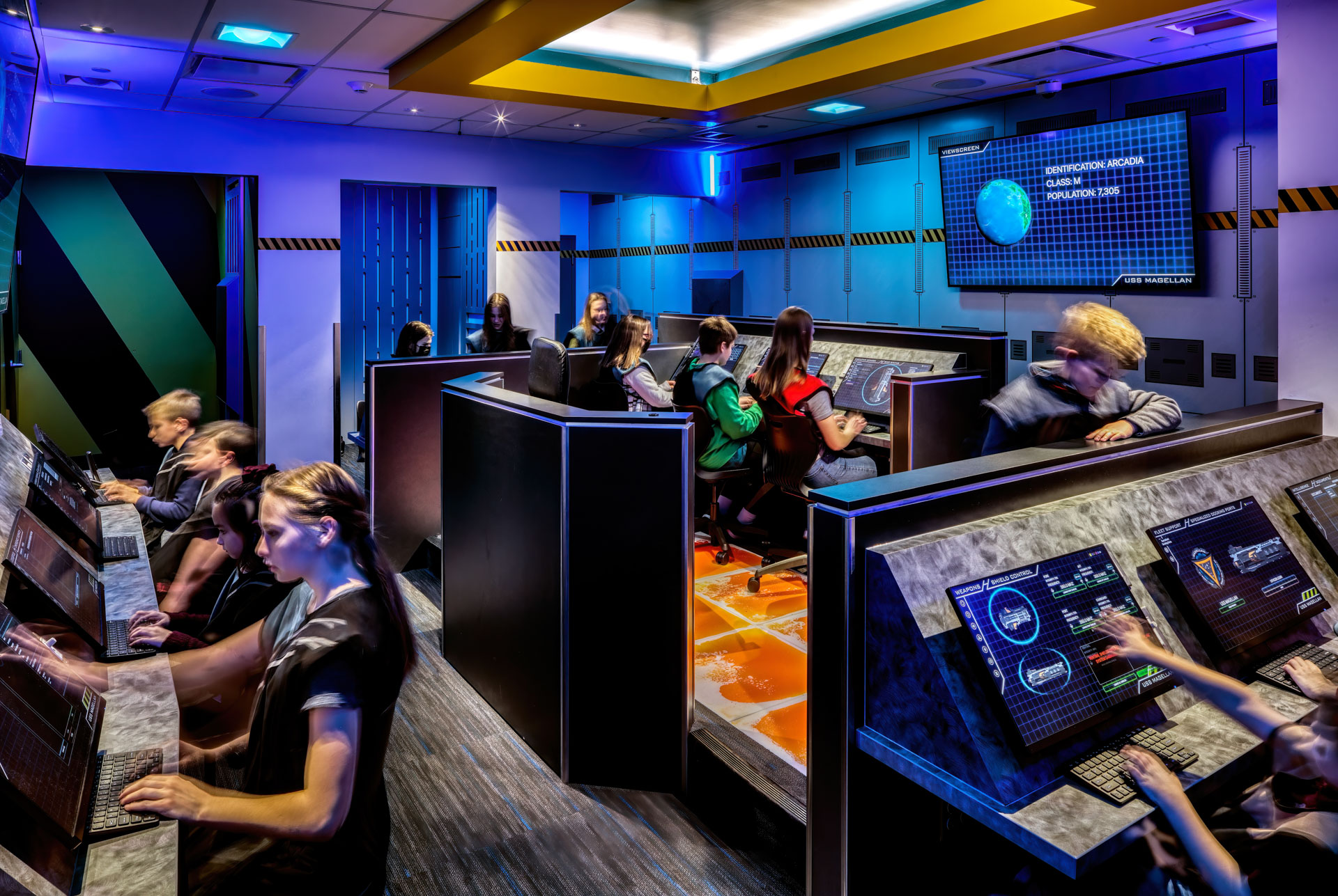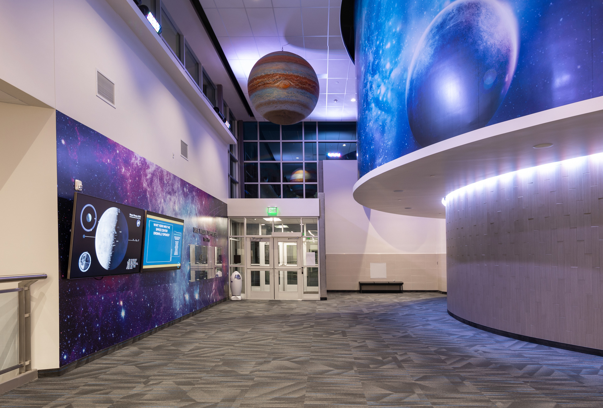 The school portion of the building totals 74,300 square feet accommodating 780 students. The compact two-story design for Central Elementary allowed the school to be built on the current site, allowing construction to take place for the new school while the existing school remained in full use. The separate 11,700-square-foot space center is designed to function year-round receiving field trips from local schools plus private groups and functions. The space center includes a 40-foot planetarium on the upper level with raised stadium theater seating for 70 spectators and a state-of-the-art digital projection system. On the lower level are six uniquely designed and finished mission simulators for groups ranging from six to fourteen participants providing an immersive experience and extending the imagination into space. Each simulator also includes an associated control room where employees and volunteers direct the unique missions. The building’s exterior finishes of brick masonry, tilt-up concrete, metal panel accents, and aluminum storefront glazing were selected to provide a high-tech space center feel while also complimenting the surrounding community. At the interior of the school, a combination of honed CMU and ceramic tile walls were selected for hallways and smooth blocks at the gymnasium and other high-use areas, for their durability and the overall structural integrity of the school. Space center finishes were also selected for durability while also providing a completely captivating experience.