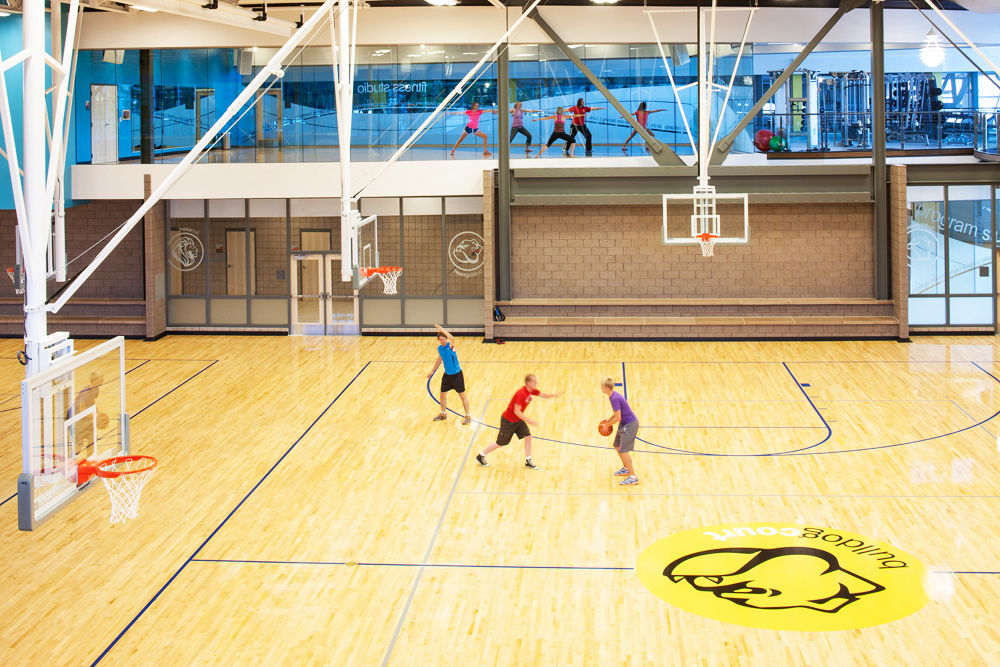 The recreation center features a three-court gym, multi-activity court gym, three exercise/dance studios, six racquetball courts, an 8,0000-square-foot fitness center, 1/5-mile elevated walk/jog track, bouldering wall cave, teen and child "edu-tainment" areas, concessions, and administrative offices. In addition to expansive locker rooms, the center also offers eighteen family changing rooms due to community input for increased privacy. An expansive senior center includes a lounge, wellness area, assessment office, classrooms, arts and crafts, library/computer rooms, 270-person community room, catering kitchen, and outdoor patio.