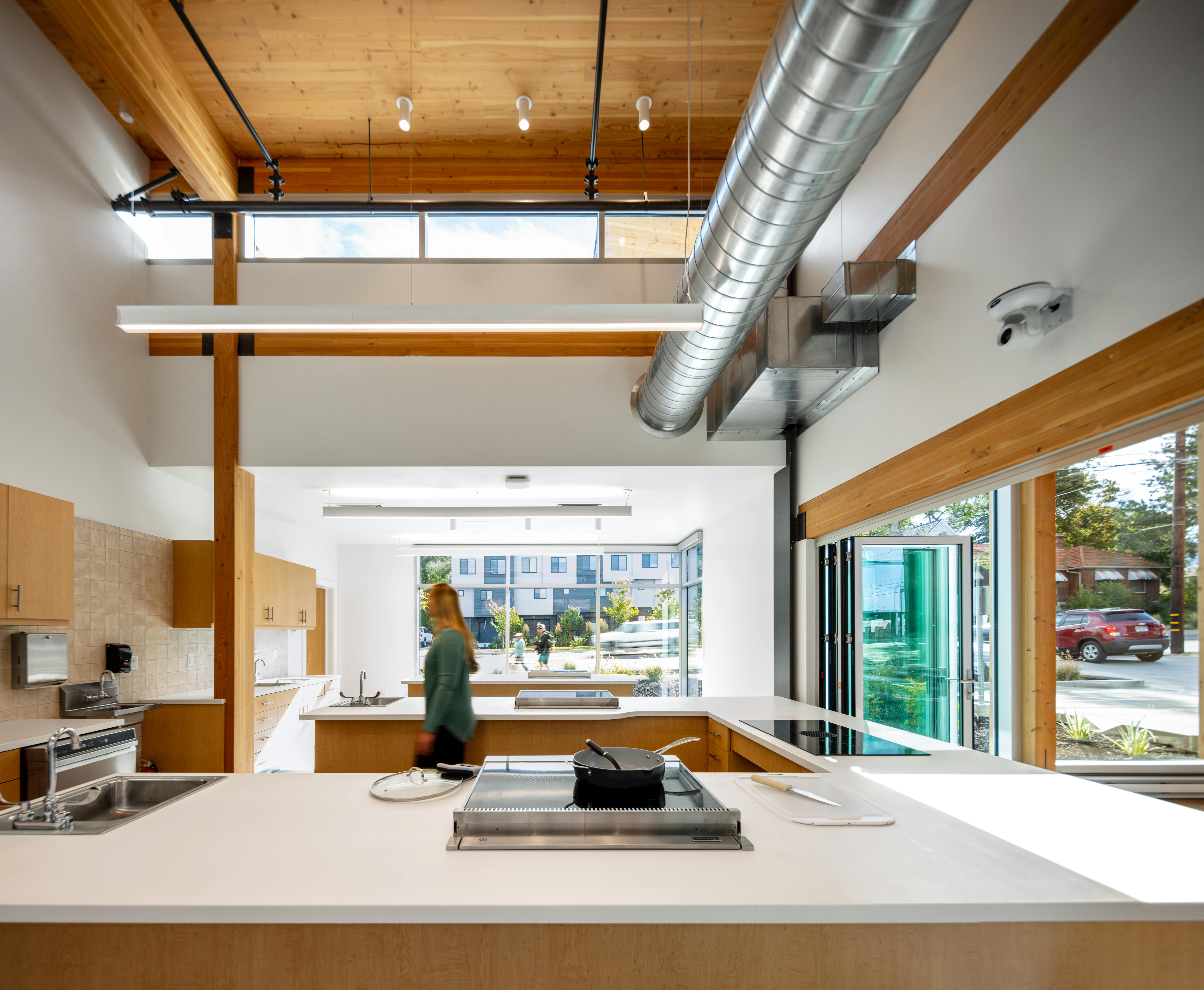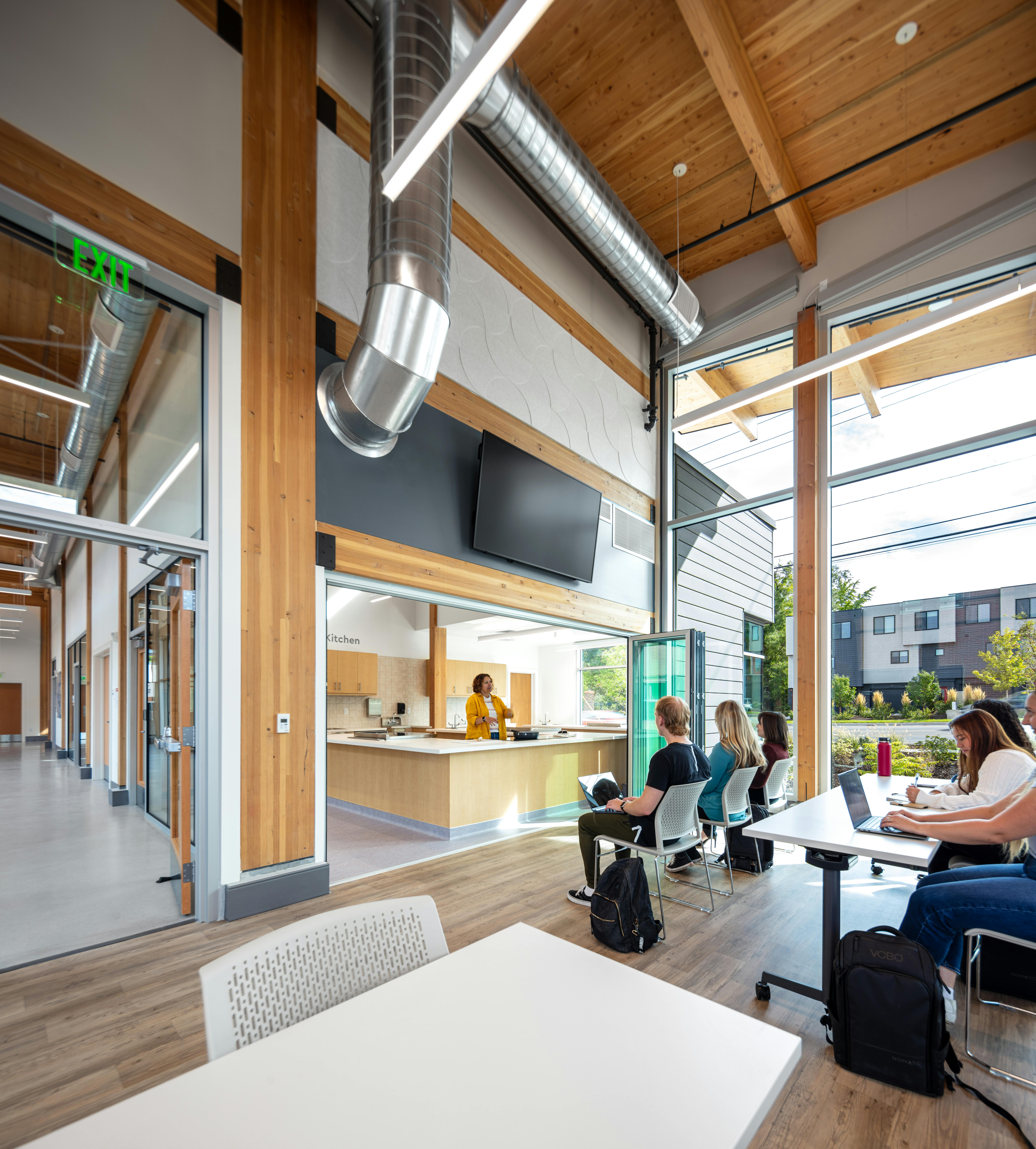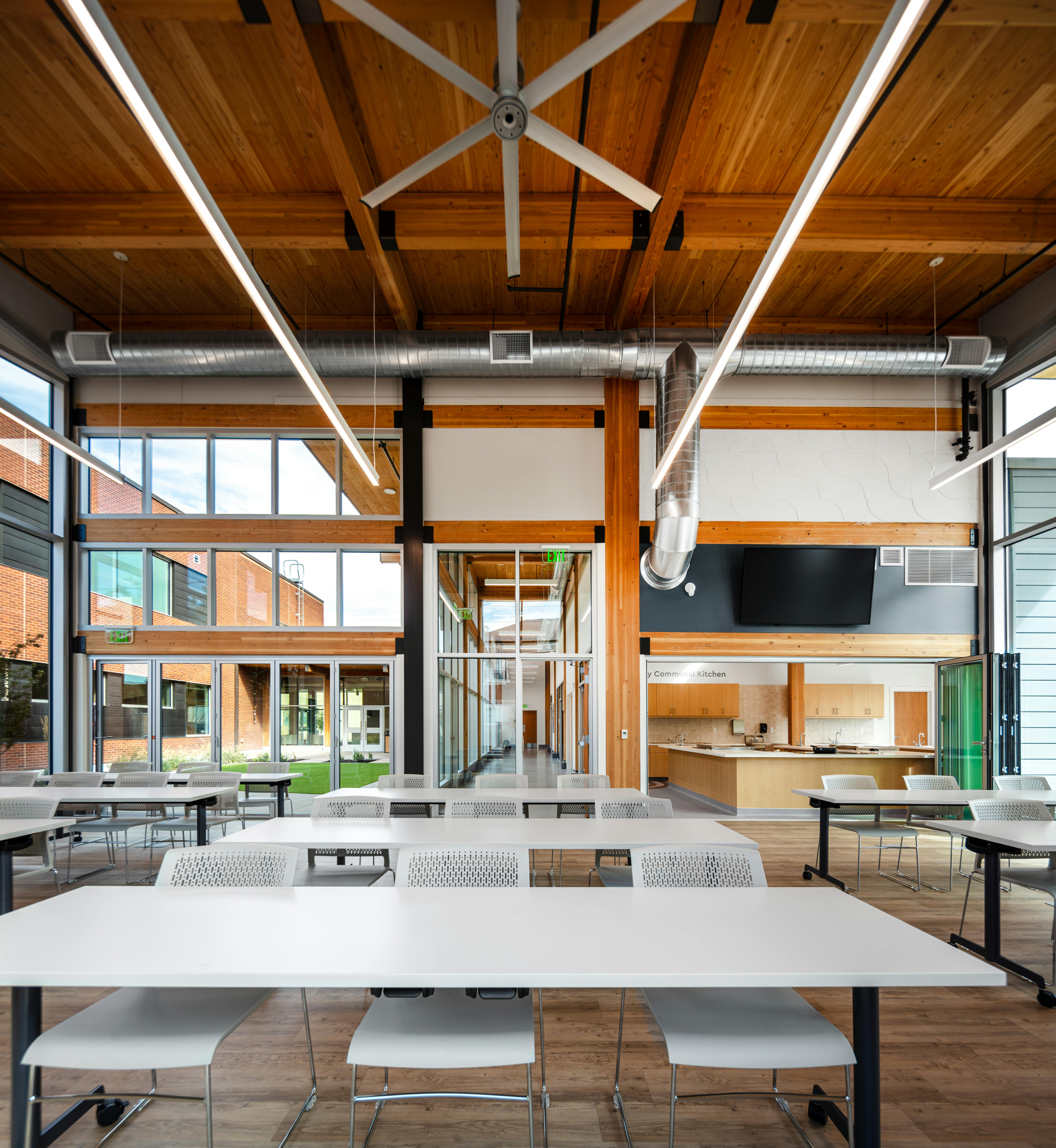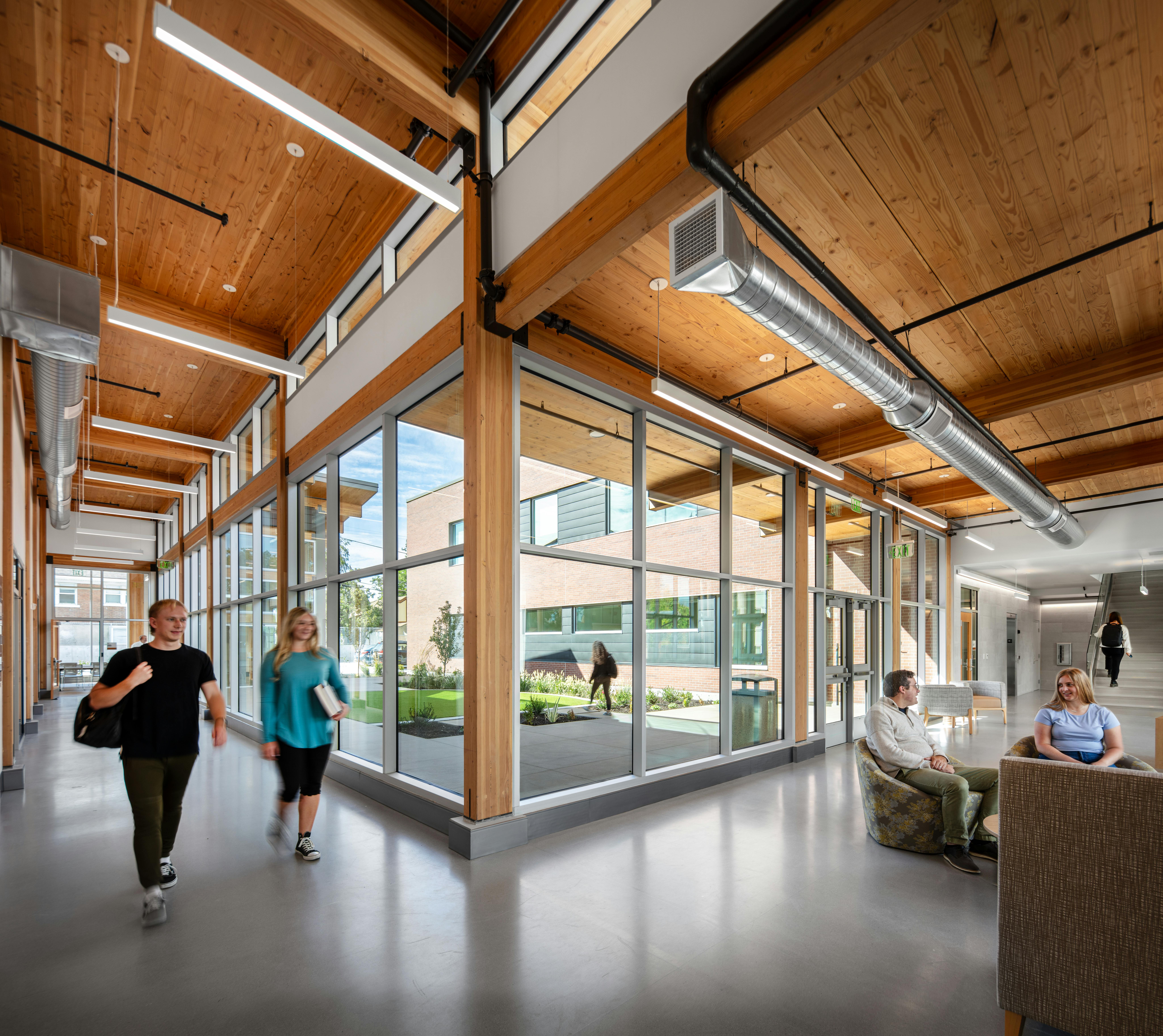 Sustainability is at the core of its design. Built with mass timber beams, columns, and cross-laminated timber (CLT) roof decking, the building operates as a net-positive energy facility. A rooftop array of 145 photovoltaic panels more than offsets energy use, eliminating reliance on carbon-based sources. Natural materials were chosen for their durability and benefits to occupant wellness, ensuring the center not only supports healthier lives but embodies them.